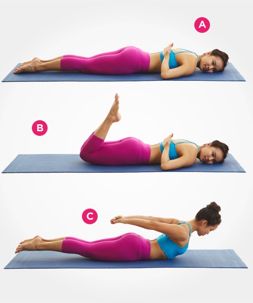 Acción: Inhala y flexiona las rodillas con las piernas juntas y los pies en punta, rebotando tres veces hacia las nalgas, con un movimiento controlado. Exhala conectando el centro y extiende las rodillas y las caderas, a la vez que elevas suavemente el tronco y las piernas, extendiendo los brazos hacia atrás estabilizando las escápulas. Inhala y aumenta la elevación del tronco elevando también las piernas. Exhala bajando de nuevo a la colchoneta y gira la cabeza hacia el otro lado. Repite toda la secuencia.
